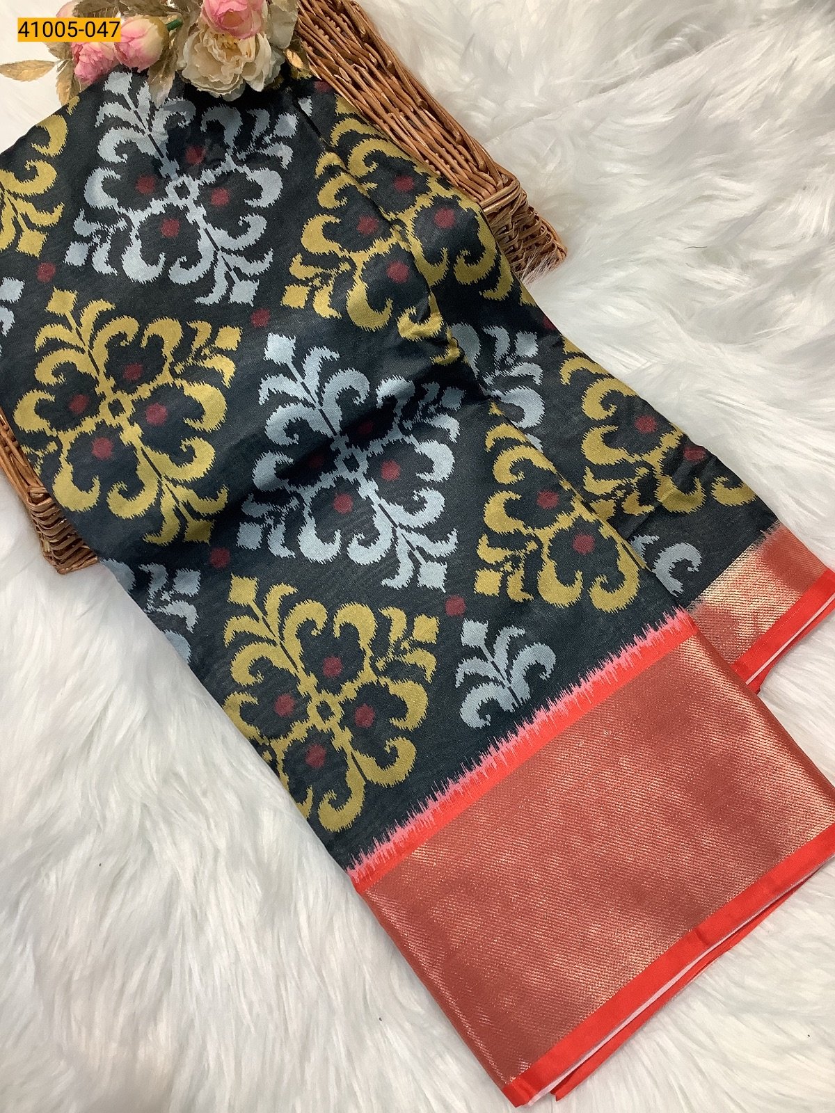 Embrace timeless elegance with this classic black Pochampally Ikat saree. The saree features intricate floral and geometric Ikat patterns in beautiful shades of mustard yellow, silver-grey, and deep red. It is complemented by a simple yet striking red border with a solid panel of golden zari, adding a touch of traditional richness. This versatile piece is perfect for both formal and festive occasions.