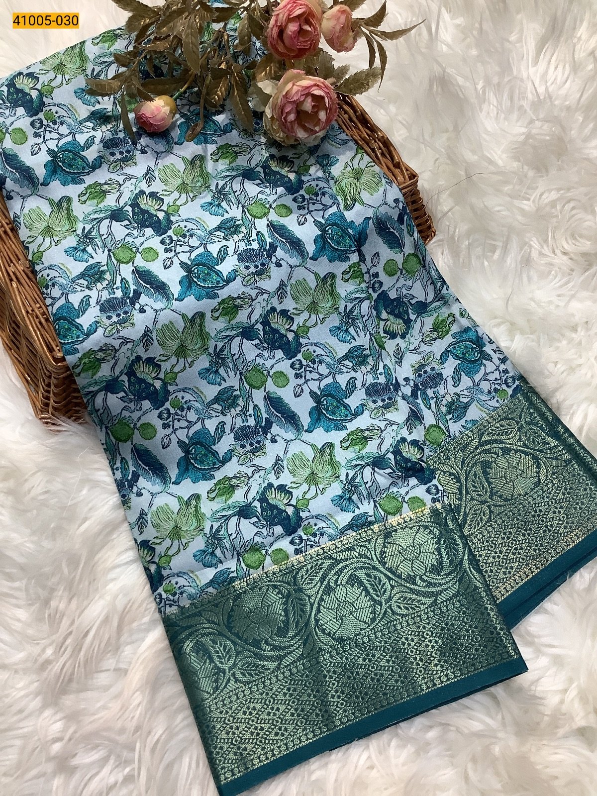 Step into elegance with this enchanting Aqua Blue Banarasi Silk Saree, beautifully adorned with floral motifs in shades of blue and green. The intricate green zari border adds a royal finish, making it perfect for weddings, festive occasions, and cultural celebrations. Crafted with finesse, this saree combines tradition with contemporary charm, making it a timeless treasure in every wardrobe.